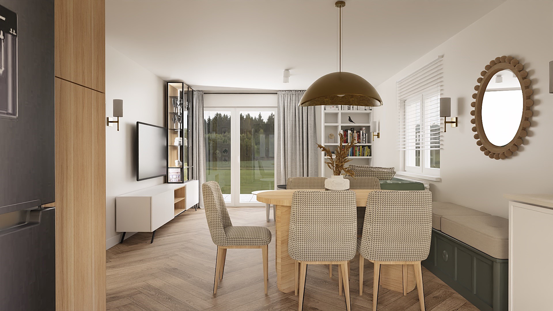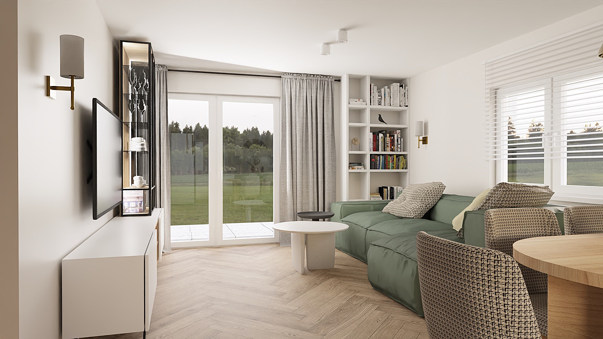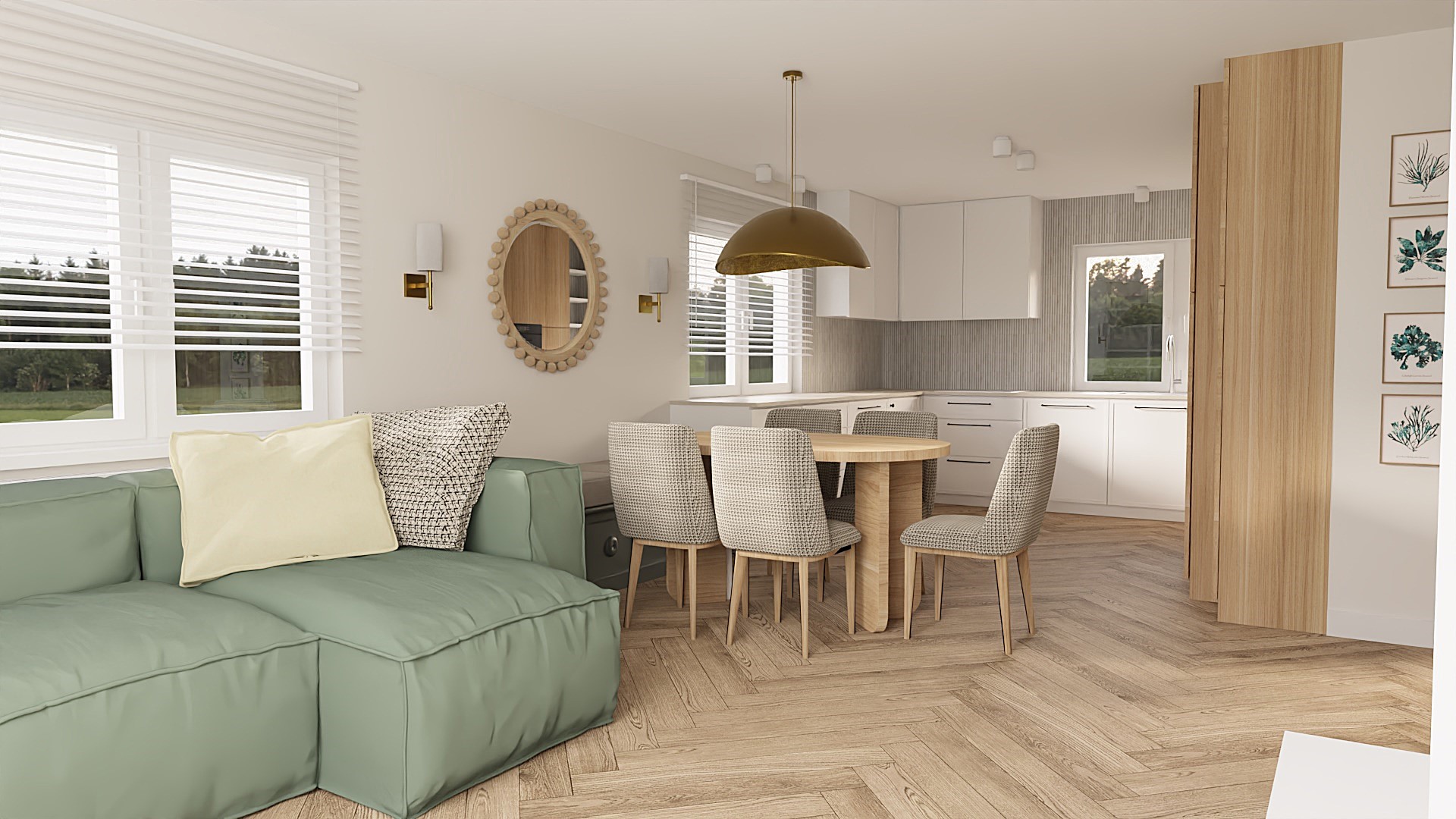- Model 3D wnętrza uwzględniający konkretne wyposażenie, kolory, materiały i dodatki